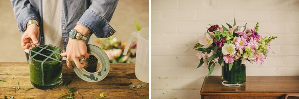 As most mothers have a favourite flower or colour, Alex suggests using one (or both) of those as the starting point for her bouquet to personalize it. From there, it’s best not to veer too far from tradition. Pinks and purples are sure to please and can be found in a wide range of local varieties. A helpful trick that Alex uses when creating an arrangement is to make a simple grid out of florist tape on the top of the vase, which helps keep all the flowers standing up in the right place.