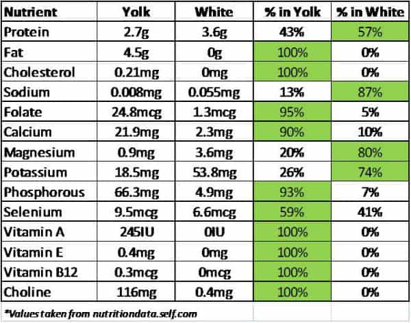 I put together this chart showing which part of the egg the main nutrients are coming from and I think it sums up perfectly why you want both parts of the egg.