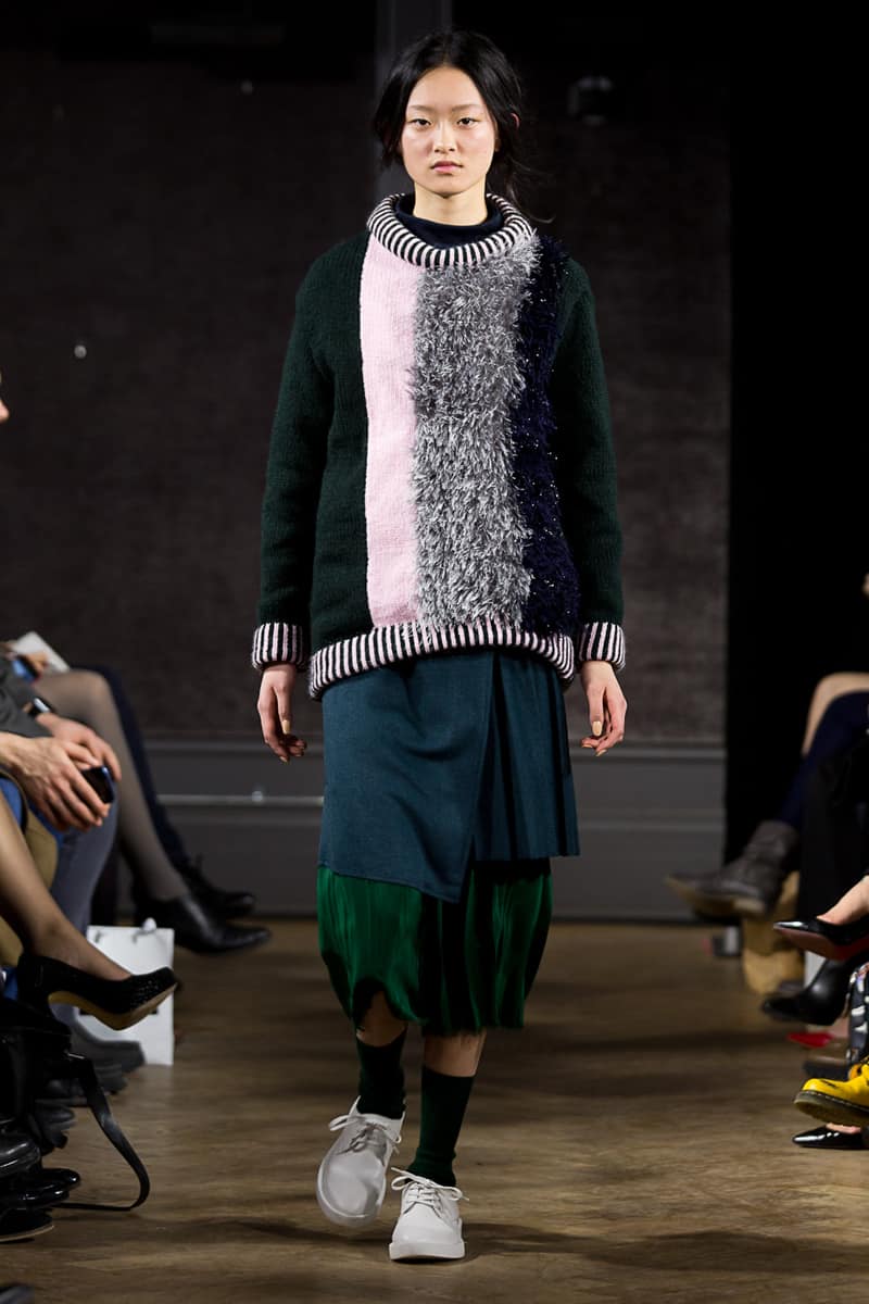 We often wonder where the creative juices begin to flow—is it nature, or is it nurture? Tai’s first atelier was a sandwich shop, and I’d like to propose that this isn’t as trivial as it might seem. Do you like lettuce on your sandwich? The uniformity of Subway’s giant bags of chiffonade lettuce are emulated in the precise layers of jacquard fringe seen on everything from jackets to dresses and pants in Tai’s F/W 2014 collection. The have-it-your-way design of any decent sub shop can be found in the core principles of Tai’s designs—he creates separates that are meant to be layered and layered, ensuring that there is no shortage of how you can combine any of his pieces. His use of six-petal applique daisies on feminine sweaters and dresses is a reminder to stay fresh (perhaps as a nod to his Eat Fresh days), while his jarring and unexpected bright yellow grouping is like finding a hint of tangy mustard in every bite of a five-dollar foot-long.