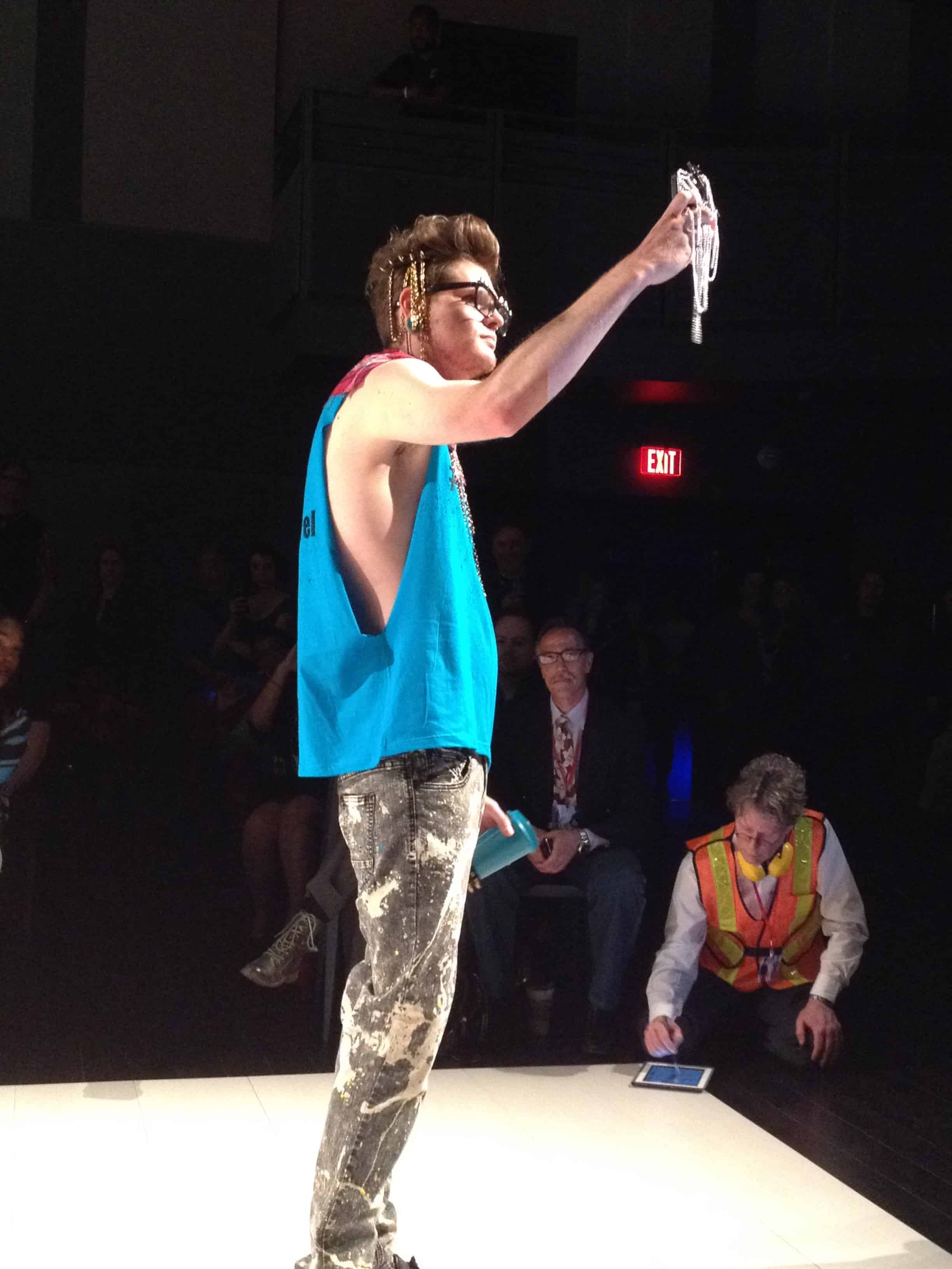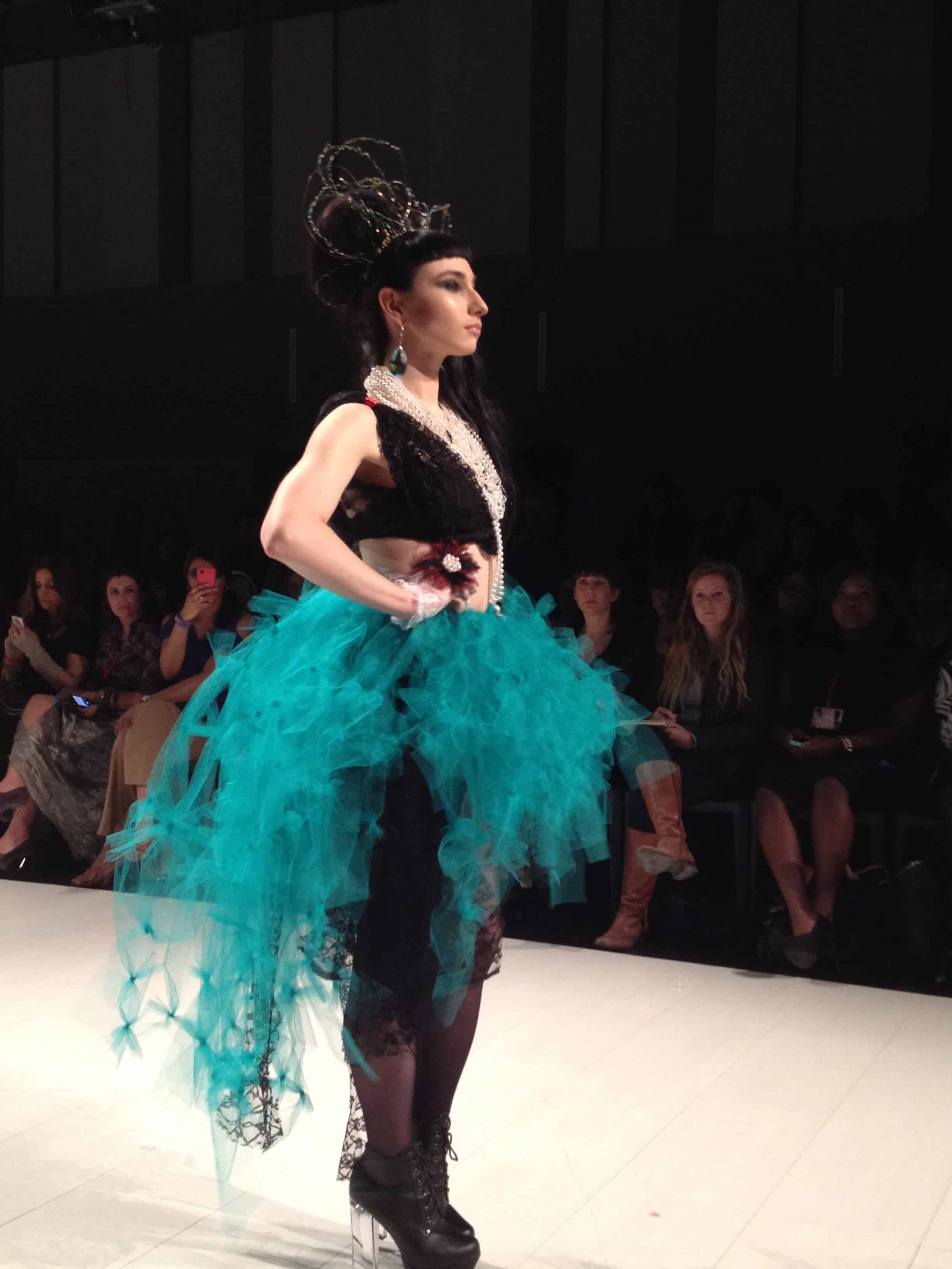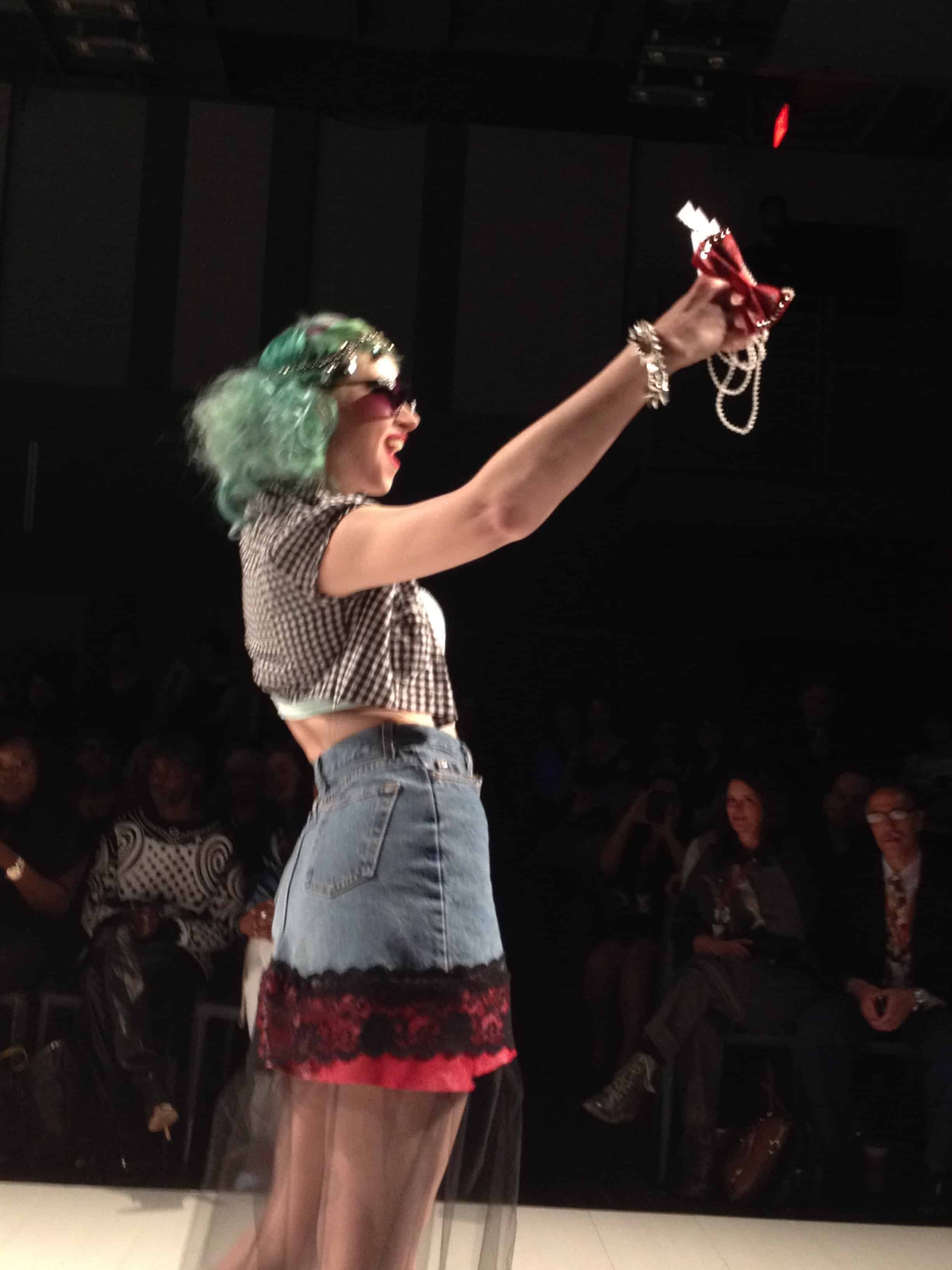 But by far, Amplify Apparel made the best use of the Grit/Glamour theme. The collection looked like the perfect combination of decadence and decay, excess and want. The models battled for space on the runway, stopping only to take selfies (narcissism, anyone?) or inject (fake) drugs. Looks ranged from a deranged Effie Trinket to a blinged out peasant followed by a tulle-clad queen.