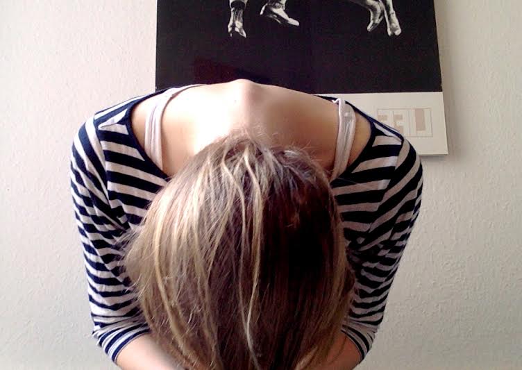 Tilt your head down, bringing all your hair to the front. This is also a bonus neck stretch.