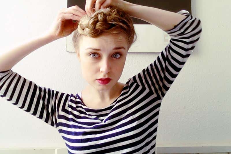 Take the end of the braid, and hinging at a mid-point just above your forehead, tuck the excess braid around and onto the top of your head.