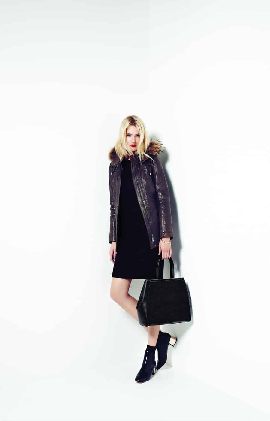 Renee lamb leather parka with fur trim hood and insulation lining. Reg. $449/SALE $249 / Kelly saffiano leather satchel. Reg $179/SALE $149