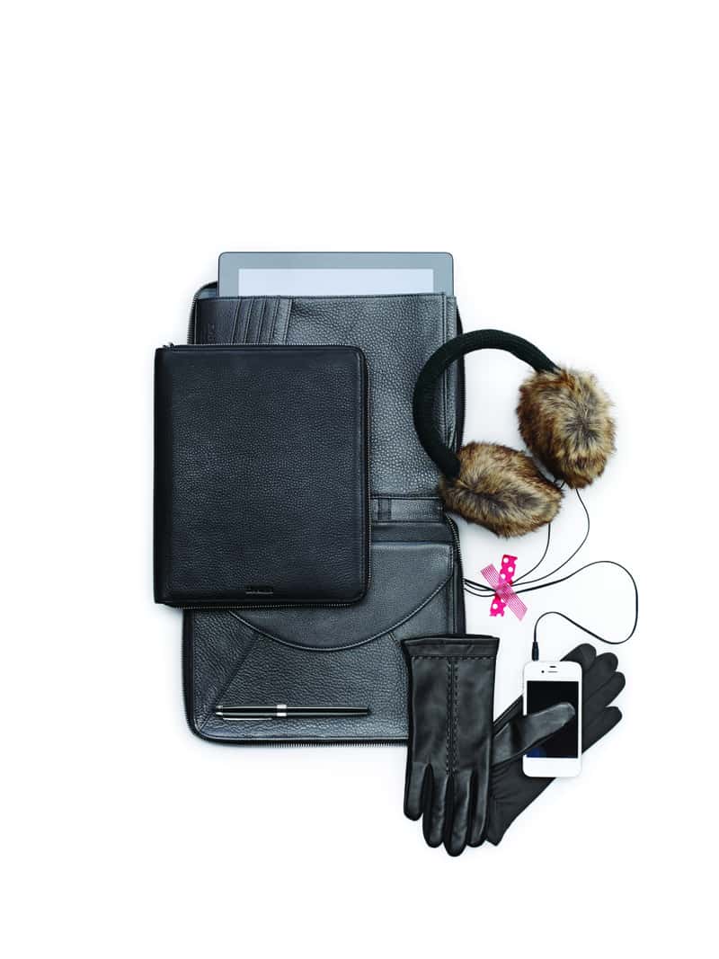 Angela pebbled leather tablet case with essential tech pen. Reg. $99/SALE $79 / Alec cowhide clean-lined iPad 2 case. Reg. $129/SALE $69 / Juniper faux fur earmuff headphones. Reg. $29/SALE $19 / Geneva lamb leather tech glove with touch screen fingertip. Reg. $59/SALE $39