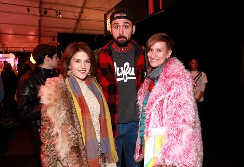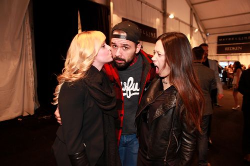 Betty (Ashley Mcintyre) and Veronica (Sarah Fukumoto) having a Double Digest moment with Kevin behind-the-scenes at the Line Knitwear show.