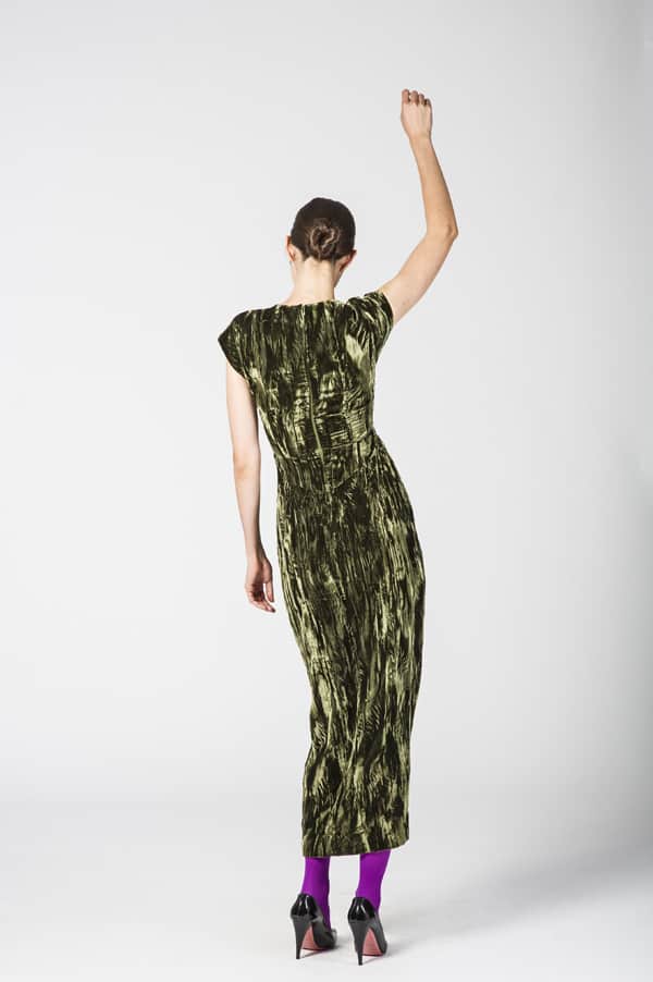 Long crushed-velvet dress in moss from Horses Atelier. Reg. $750 / SALE $400! Designers Claudia Dey and Heidi Sopinka bring magic to holiday evening wear. But it’s up to you to start the kitchen dance party.