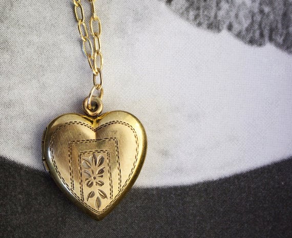 The Valerie gold engraved  heart locket by The Symmetric on Etsy, $74.00. Based out of Collingwood, Ontario, Shanan Kurtz and Gillian Sopinka have an amazing knack for finding covetable vintage clothing and antique jewellery.