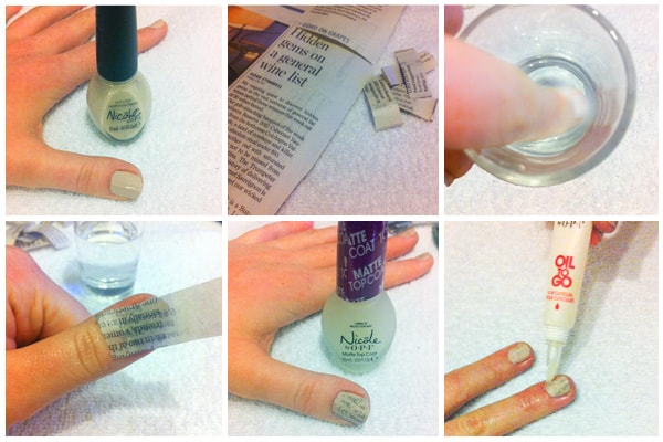 - After removing the newspaper and letting your finger dry completely, paint a matte topcoat onto the entire nail.