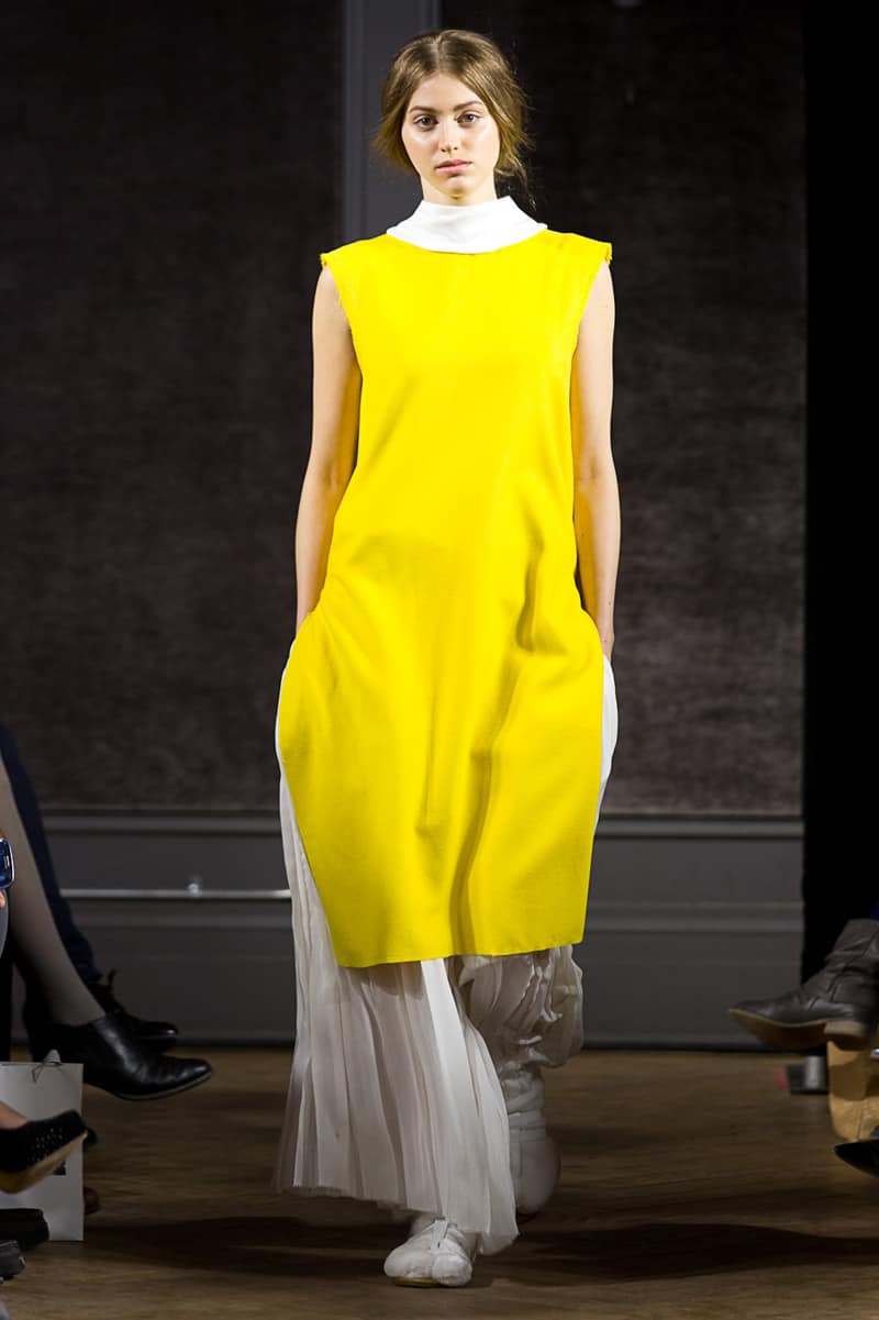 We often wonder where the creative juices begin to flow—is it nature, or is it nurture? Tai’s first atelier was a sandwich shop, and I’d like to propose that this isn’t as trivial as it might seem. Do you like lettuce on your sandwich? The uniformity of Subway’s giant bags of chiffonade lettuce are emulated in the precise layers of jacquard fringe seen on everything from jackets to dresses and pants in Tai’s F/W 2014 collection. The have-it-your-way design of any decent sub shop can be found in the core principles of Tai’s designs—he creates separates that are meant to be layered and layered, ensuring that there is no shortage of how you can combine any of his pieces. His use of six-petal applique daisies on feminine sweaters and dresses is a reminder to stay fresh (perhaps as a nod to his Eat Fresh days), while his jarring and unexpected bright yellow grouping is like finding a hint of tangy mustard in every bite of a five-dollar foot-long.