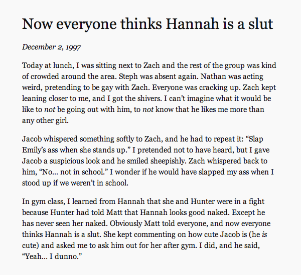 Yes. There was a time in my life (coming up in the diary entries) when I used to cut my arms and hope I would bleed to death, or sit in my parents’ basement in the winter and think about the possibility of freezing to death. As a preteen, it was impossible to have perspective about all the wonderful things to come in my life. I felt trapped and could not see beyond the constant harassment I endured at school, after school, and online. I’m now a Harvard graduate, PhD candidate, and freelance writer with a wonderful, supportive, live-in boyfriend, a great relationship with my parents, and many close friends whom I trust. It got better for me and for many other women; I want to provide that hope to girls currently being sexually bullied.