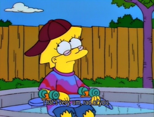 Which isn’t a thing. All of us are uncool. We are all un-hip. But thank goodness: that’s why so many different movies/TV shows/bands/artists/books exist. We are all Lisa Simpson finding Homer’s car covered in seashells, surprised that people like us for us. More importantly, we are all Lisa Simpson learning that like they told us all along, we just have to be ourselves. (And I would kill for her tie-dye shirt.)