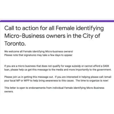 “The Canadian Government has offered options for small and medium sized businesses in hopes of lessening the financial burden. Unfortunately, small business, especially in Ontario is a large umbrella. There are many “micro-businesses” that do not qualify for wage subsidy and are not in a position to take on a financial burden of a loan,” reads an excerpt from the open letter, explaining the dire situation.