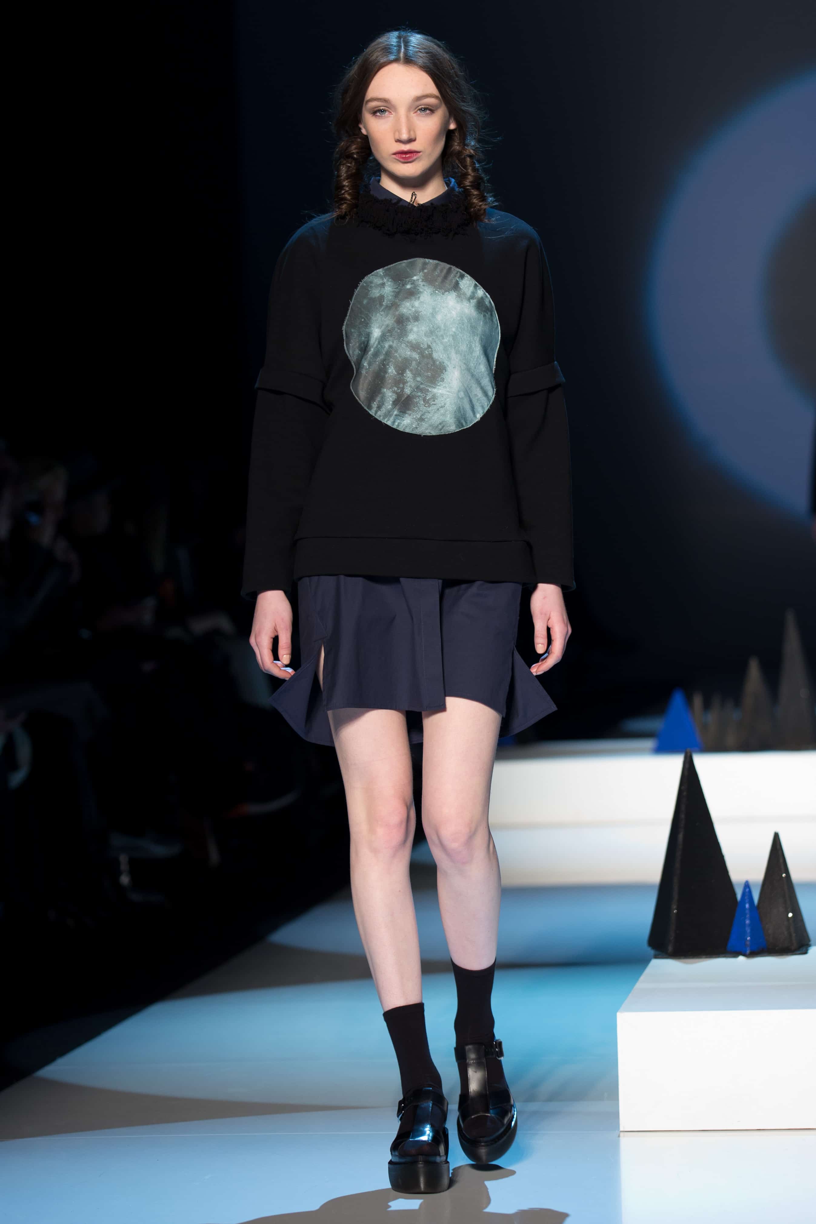 Last night was the latest season from Mercedes Benz Start-Up, featuring designers Matierre Noire and Malorie Urbanovitch. Matierre Noire started with this penetrative, repeating noise that was so obnoxious and grating I felt like I might have a panic attack. Then the show started, and everything made a little more sense. The show began with digital art that was equal parts Illuminati-inspired, and something born of an acid trip. It gave way to a collection that could have easily been inspired by the movie Hackers, featuring gangs of futuristic nomads in applique moon sweaters and wool wrap dresses with leather belt-strap closures. It was unmistakably au courant, in that most of the models were wearing platform sandals with socks, which I was very into.