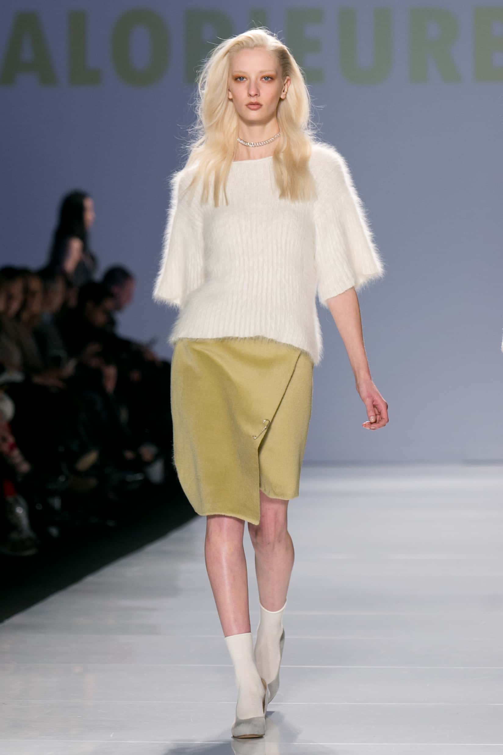 It was in perfect contrast with the basic prep looks from Malorie Urbanovitch—each girl looked put together, with a little edge. White ribbed sweaters and black knit dresses stood out as her strongest pieces, and most looks were balanced with white socks and black shoes or black socks and black shoes. It reminded me of prep school girls I’ve known who smoked and had their Stephanie Kaye game down to a science. I wanted to be or chill with Malorie Urbanovitch’s basic bitches.